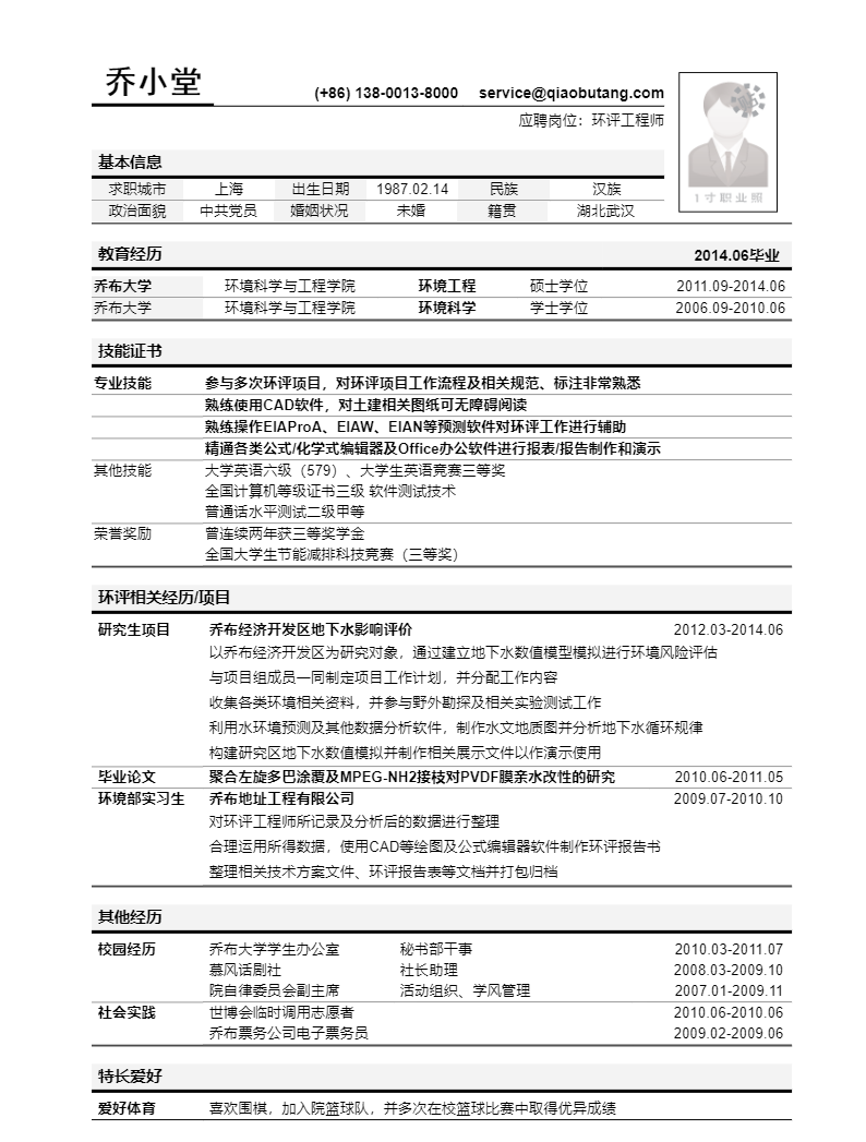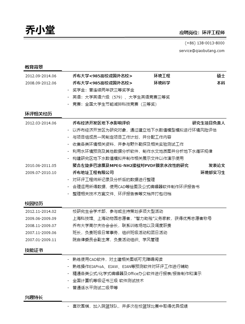 环境影响评价工程师/环评工程师简历模板(校园经历多)