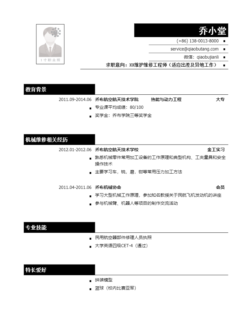 飞行器及部件维护维修人员简历模板(突出专业能力)
