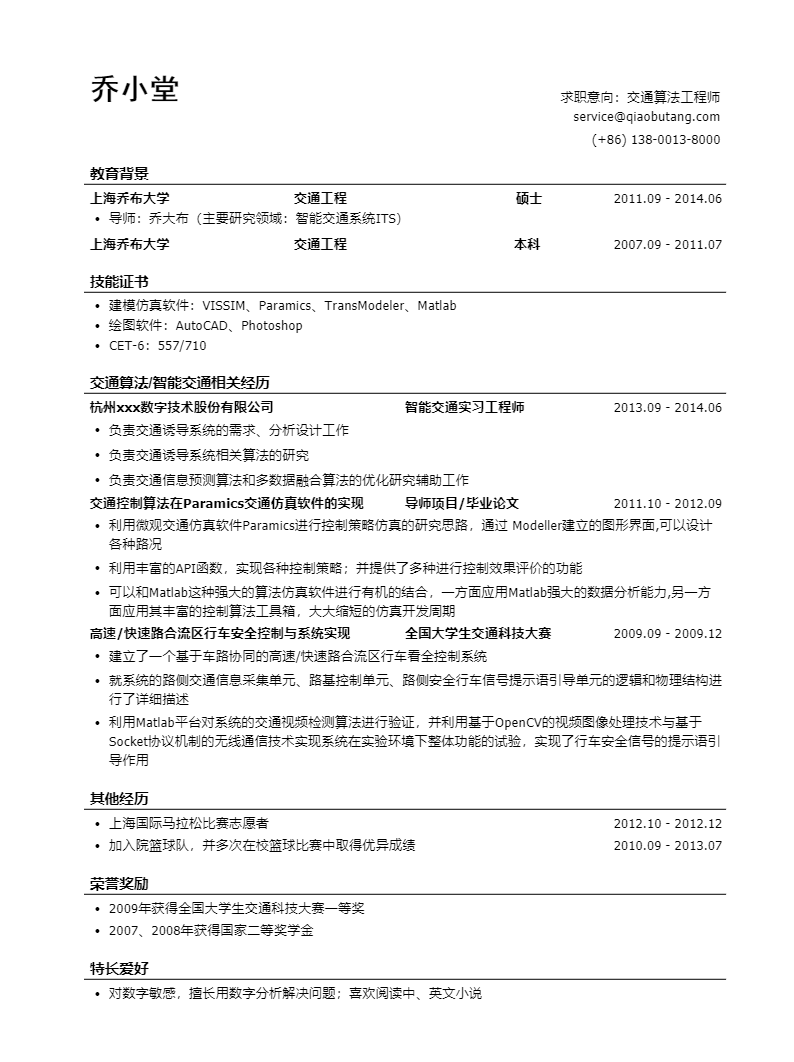 交通算法工程师简历模板