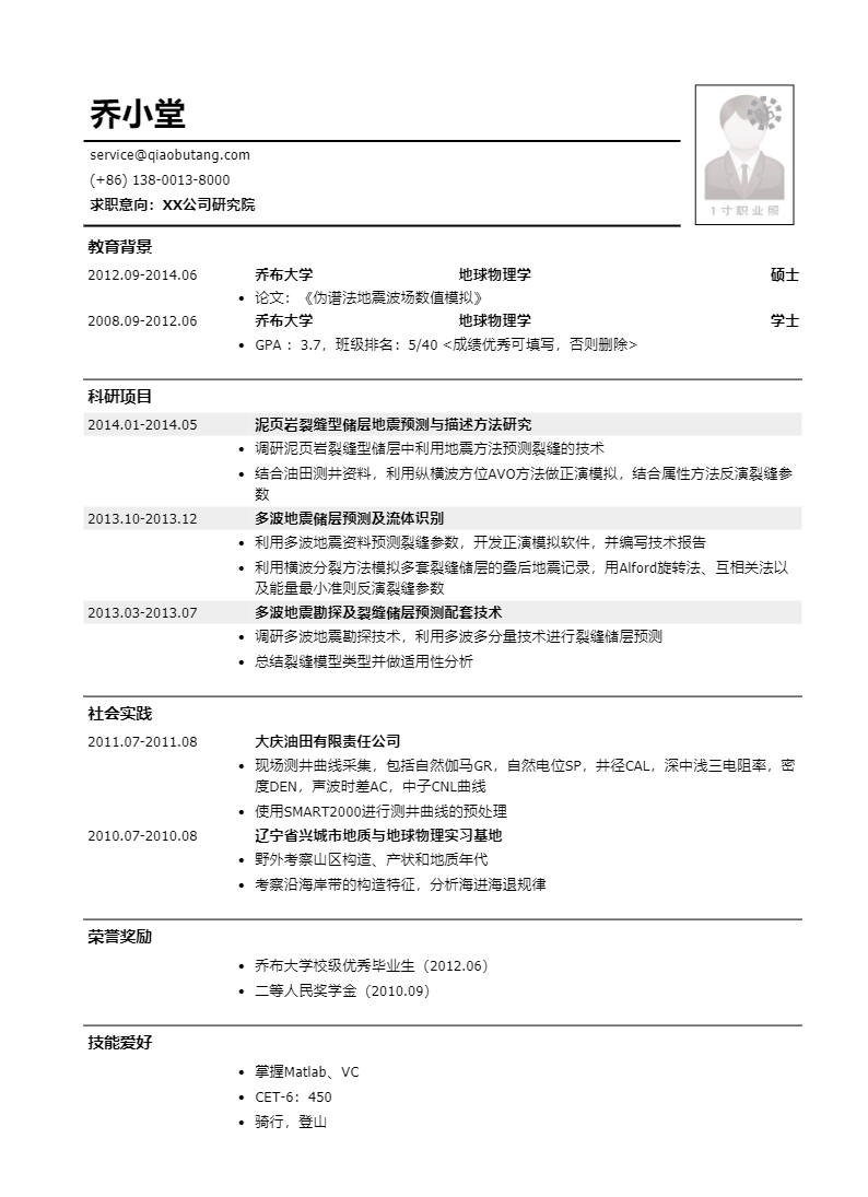传统能源研究院研发岗位简历模板(应届生初级岗位)