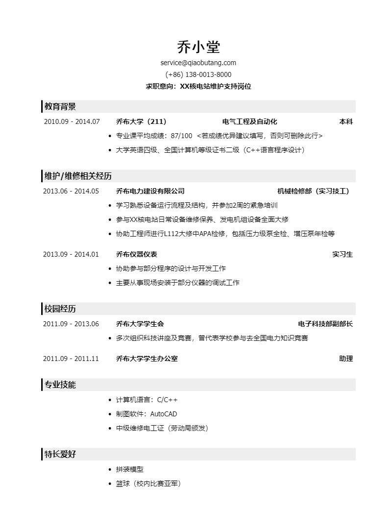 核电站维护支持岗简历模板(应届生初级岗位)