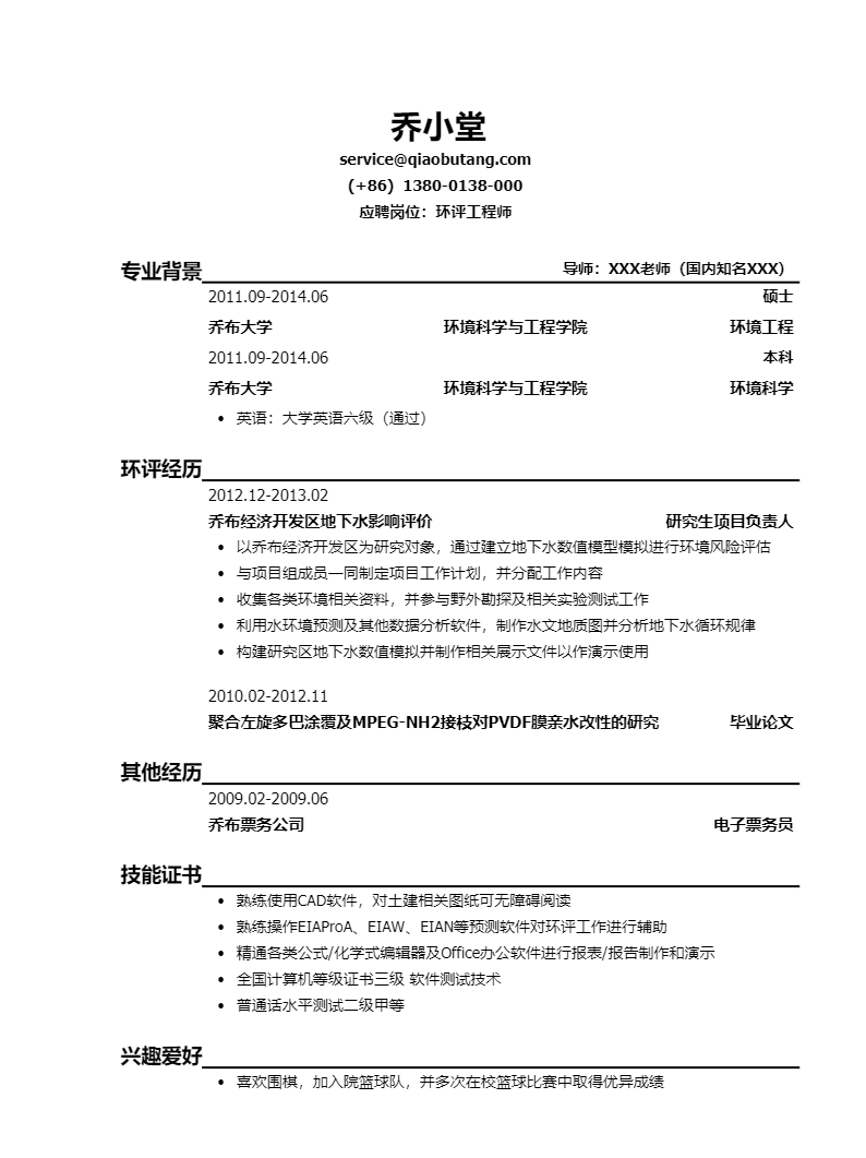 环境影响评价工程师/环评工程师岗位简历模板